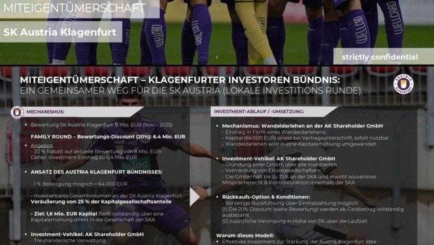 Gesellschafter Zeljko Karajica hatte ja bekanntlich ein Investoren-Papier ausgeschickt, das auch der „Krone“ zugespielt wurde. In welchem die Austria Klagenfurt offensichtlich händeringend – mit Rabatten, Rückkaufoptionen und Zinsen – nach frischem Geld sucht: Unter dem Titel „Miteigentümerschaft – Klagenfurter Investoren Bündnis“ wirbt der Zweitligist da um Kapital.